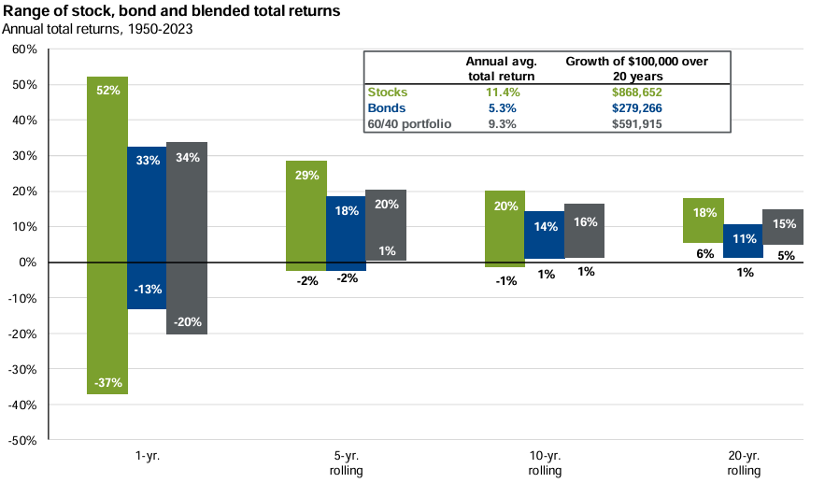 These were not isolated results. The JP Morgan chart below highlights S&P 500 Index returns for the last 73 years (1950 to 2023). Over a one-year period of rolling returns, the best return over that 50-year time frame was +52% and the worst was (-37%). Contrast this with the rolling twenty-year returns which shows that investors who held their index positions for at least 20 years never lost money. The worst an investor could have performed would have been an average of +6% per year, and during the best 20-year period, they would have achieved +18% per year.